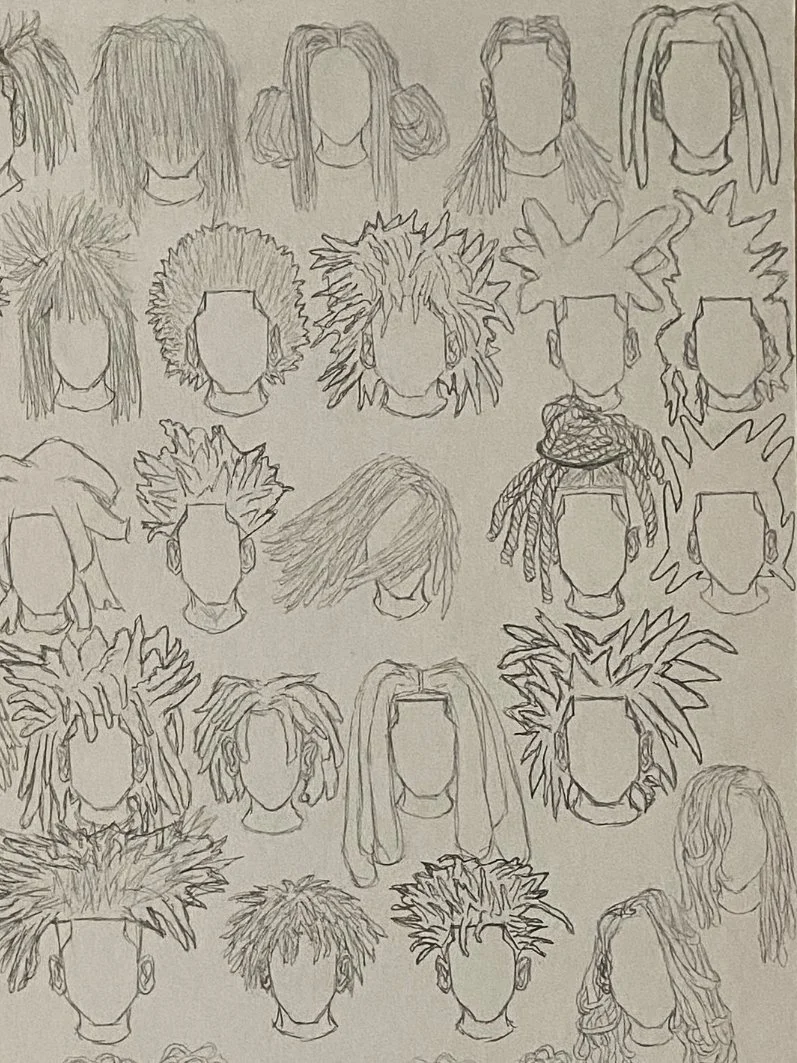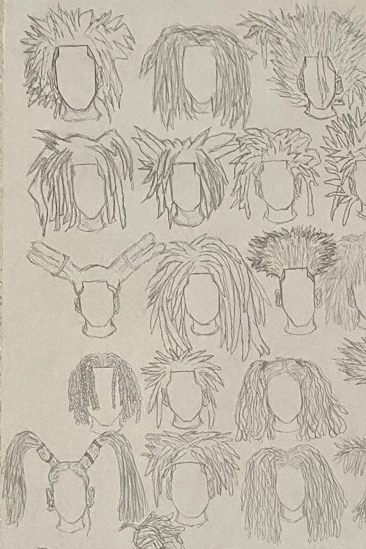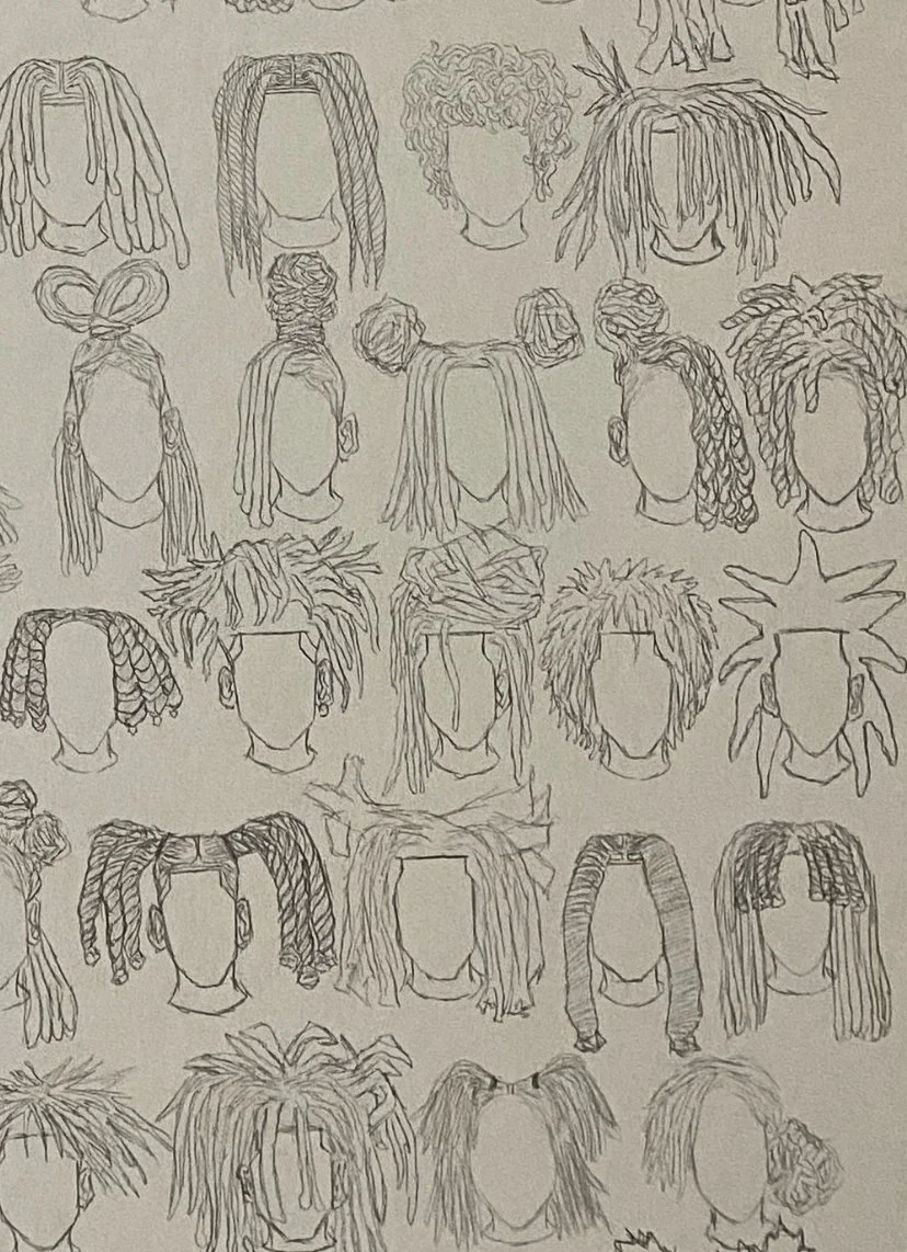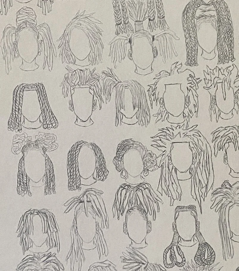 176 different black dreadlock hairstyles that I created. My dreadlocks are connected to me and represent my journey into adulthood and hold great significance to my appearance and soul. This piece was made to celebrate that and show how powerful this hairstyle is and the ways it can be changed.
