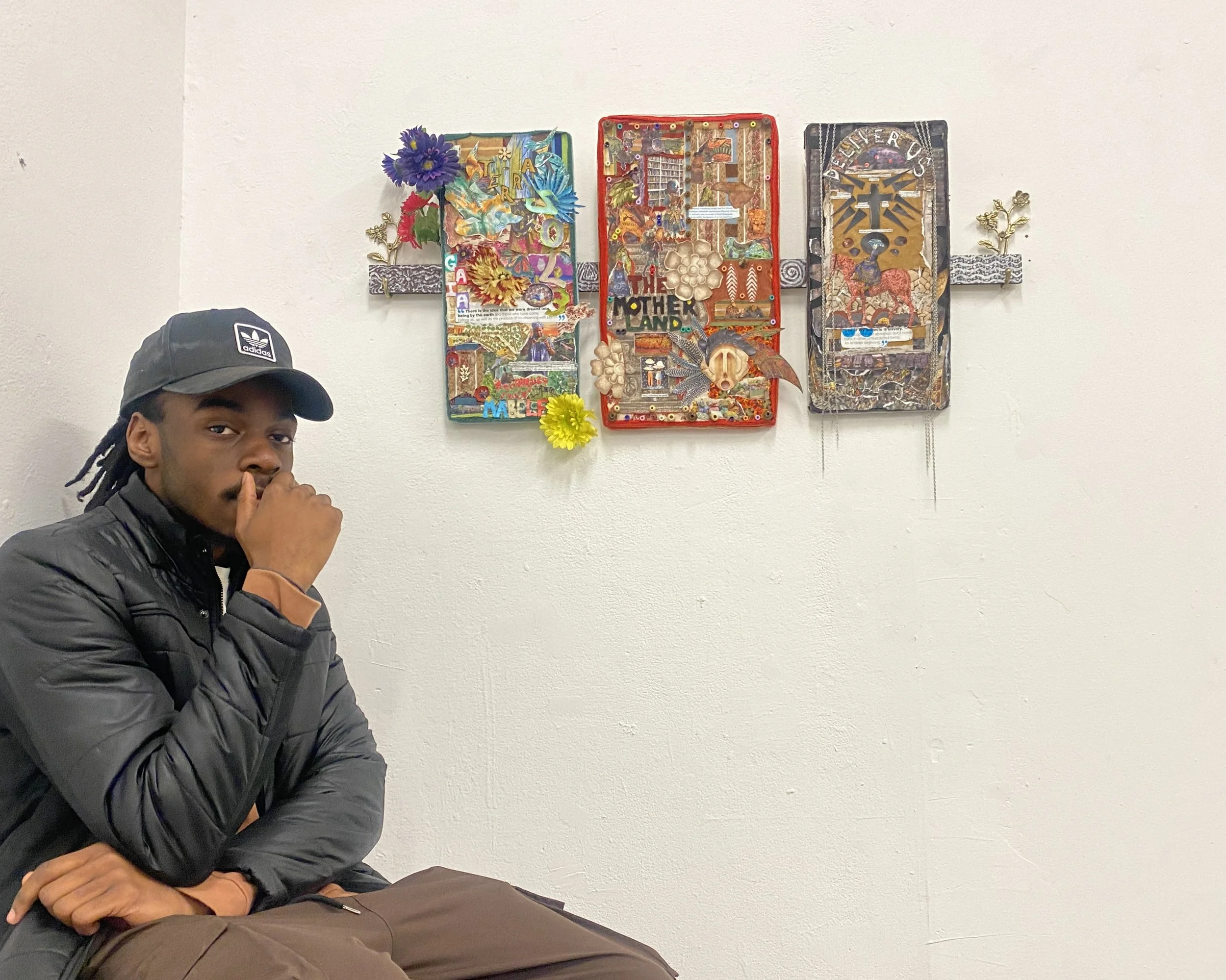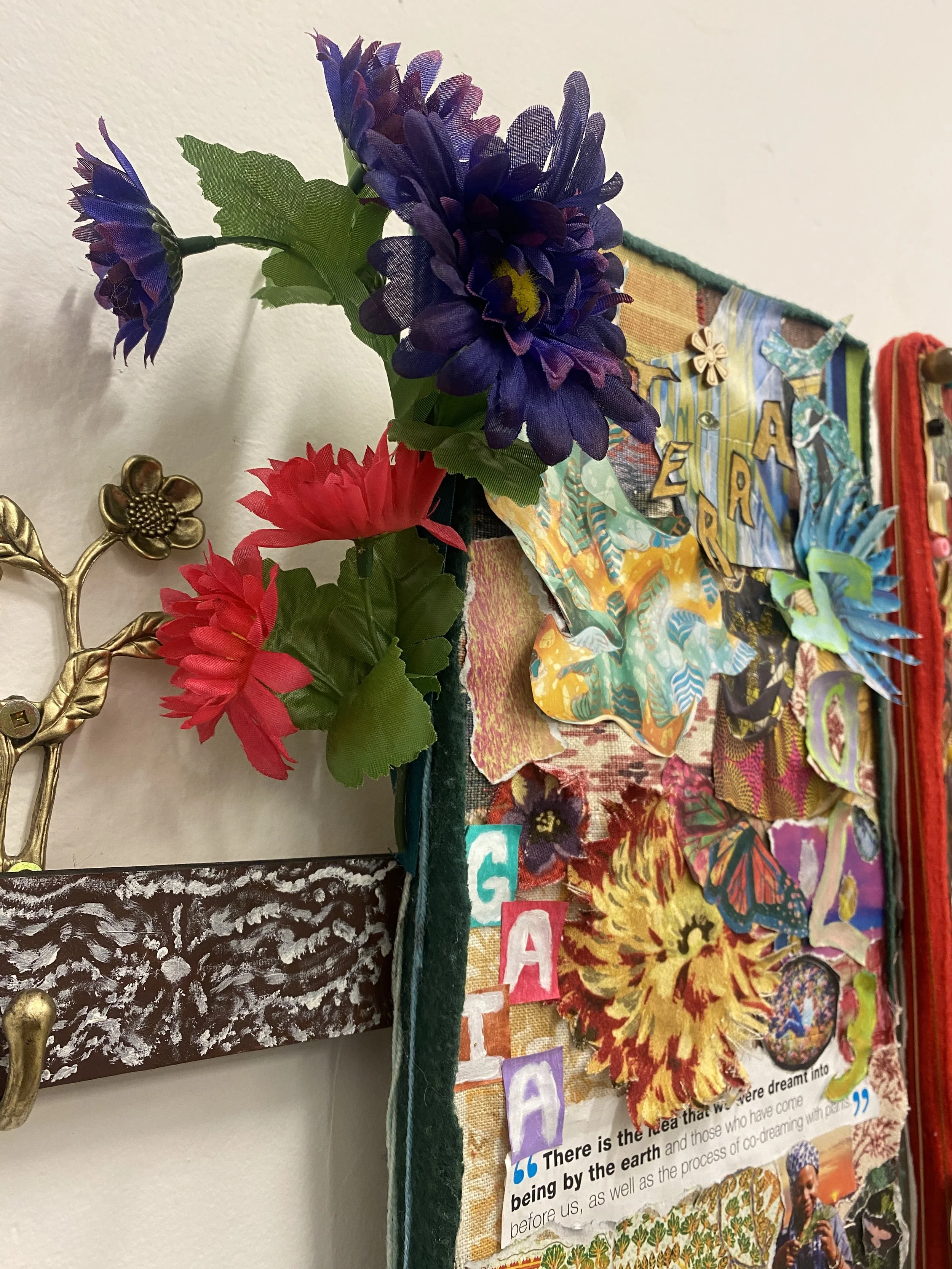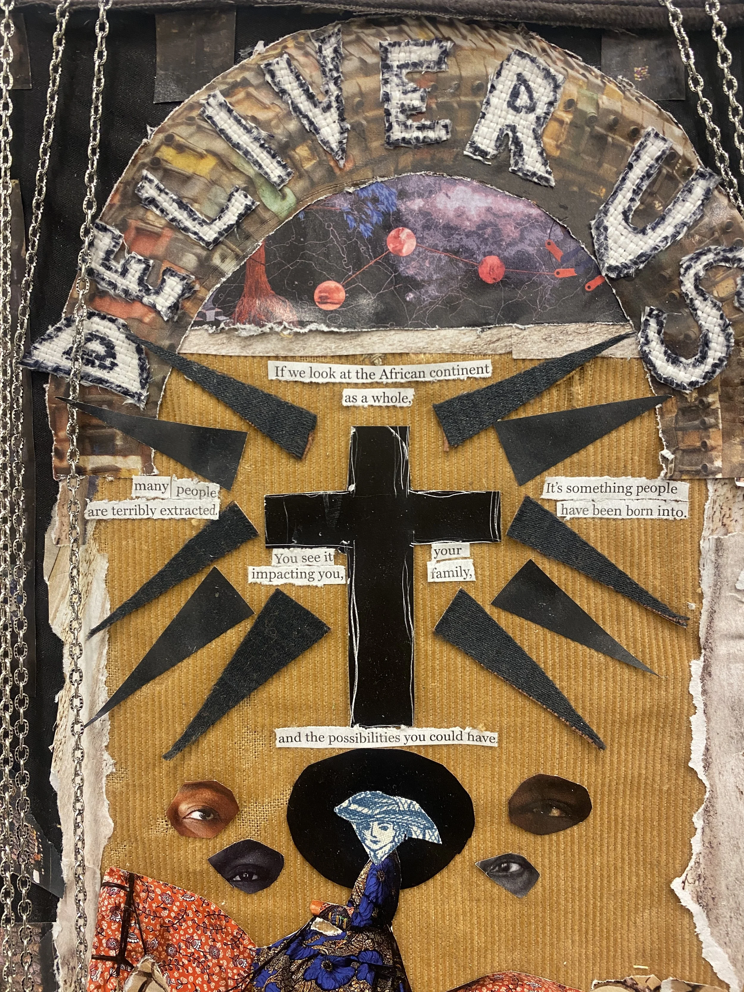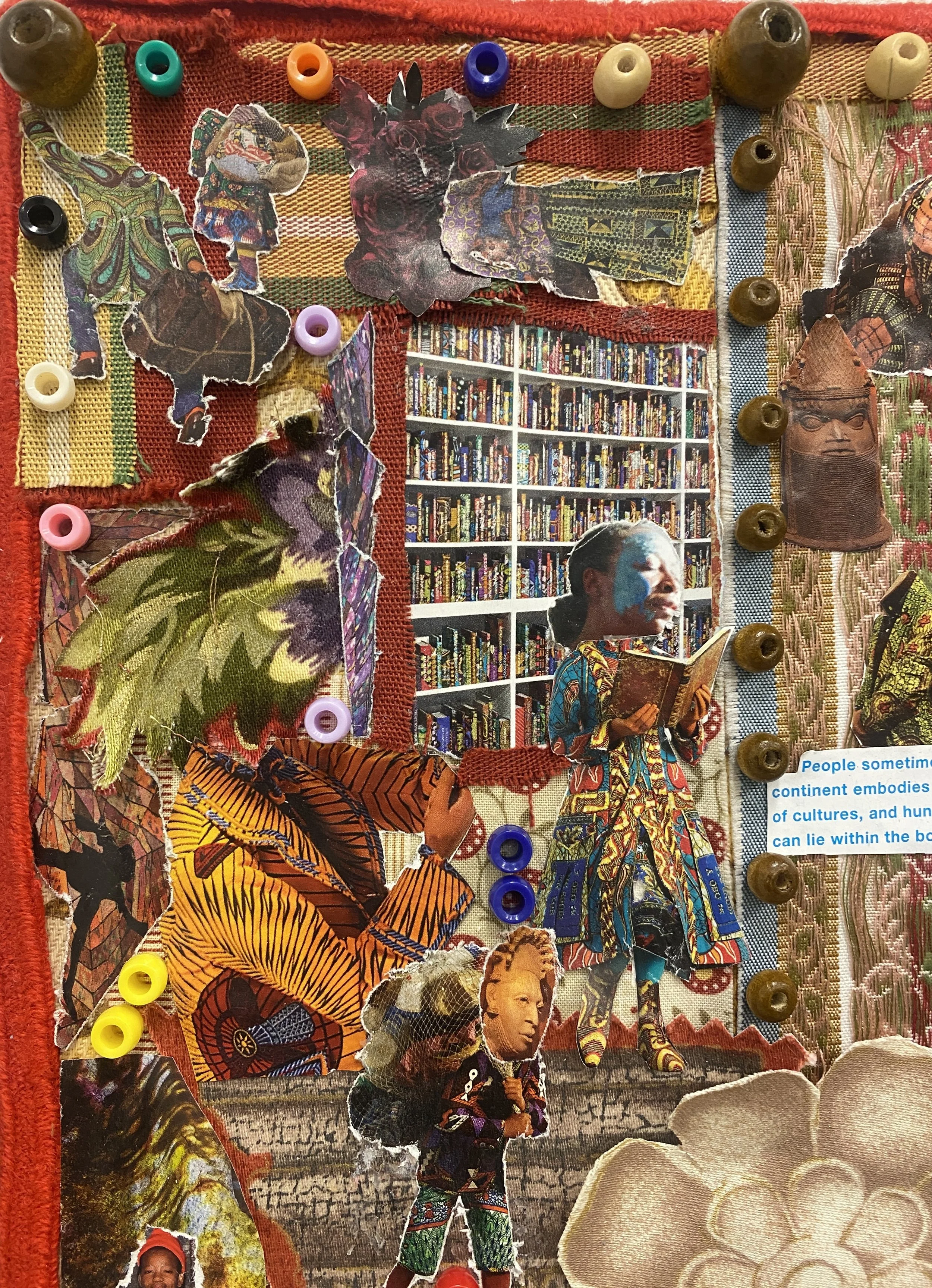 Inspired by the works of African artists such as dineo seshee bopape, yinka shonibare, otobong nkanga,and romauld hazoume, I was able to use their works to recreate a new piece that shows the story of Africa. Done with magazine papers, fabric, wood, plants, beads, and other accessories. Thus resulting into a narrative textile collage piece which evokes the spirit of Pan Africanism, while educating and guiding the viewer into the story of the legendary continent of Africa.